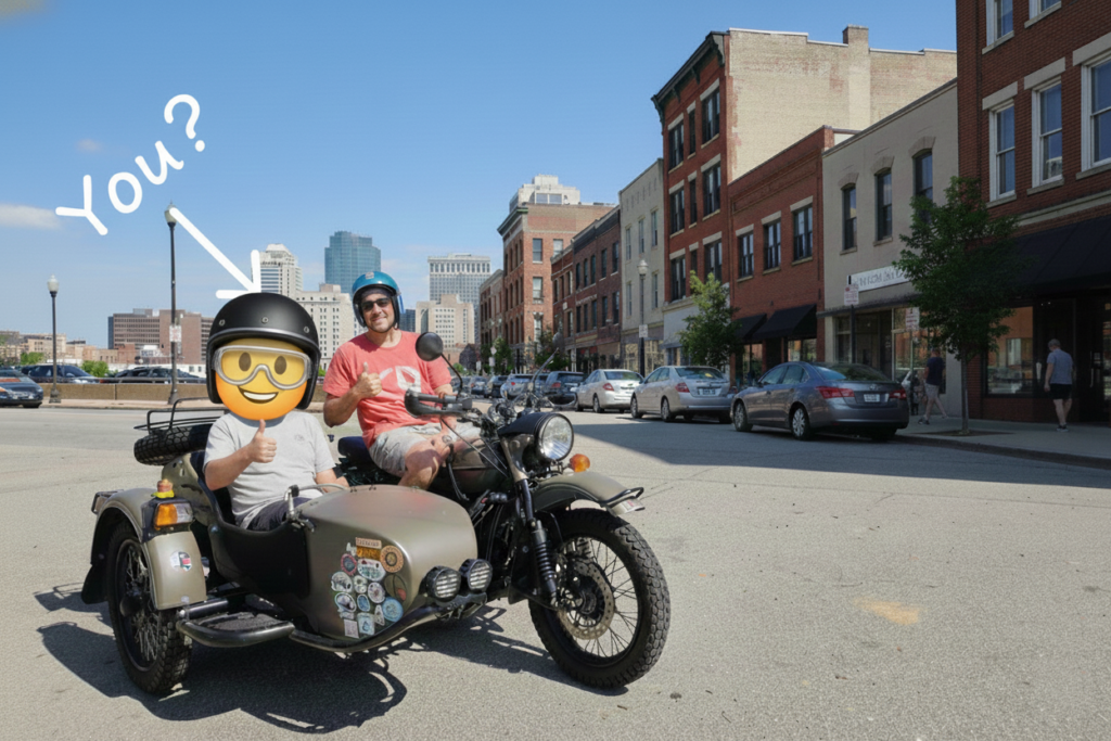 I’m Jake. I have a sidecar motorcycle in the Cincinnati / Northern KY tri-state area. Riding it is awesome, and I think sharing the experience with other people is awesome!